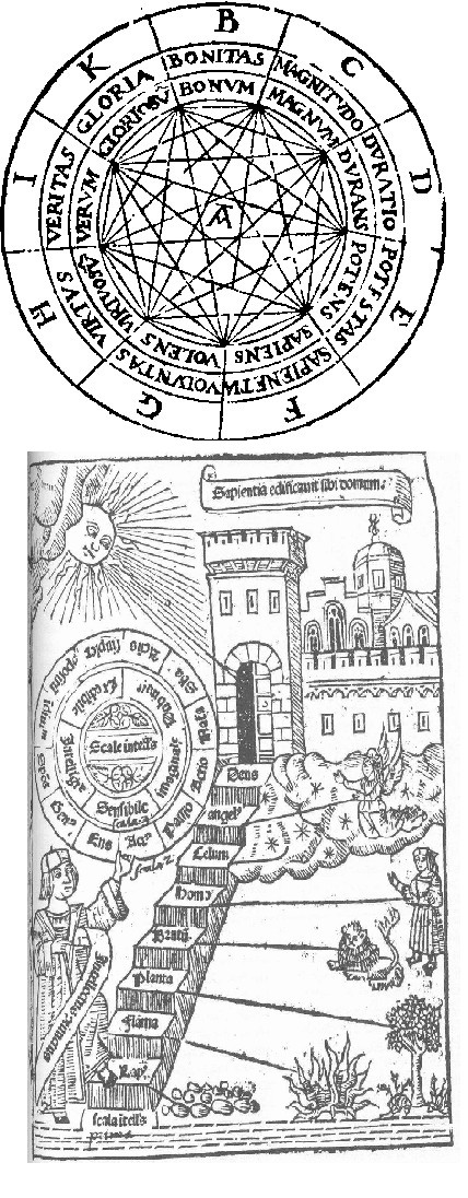 I don't know much about it, but from what I understand, Llull's art involved setting out some basic aspects of The Divine (qualities like greatness, goodness, virtue, truth, wisdom, etc.), then assigning letters to represent these qualities and placing them on circle or wheel. Contemplating the combinations of these qualities with other principles was, I think, supposed to lead one to higher truths.